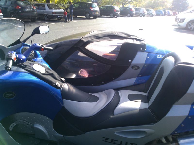 Celle-ci s'agrandit davantage, c'est ma meilleure tout simplement parce que la mieux exposée par rapport au soleil. Il s'agit d'un side car de la marque Side-Bike et originaire de la Vienne, modèle ZEUS ! Quel nom magnifique ! Avec en plus un Tigre sur le capot arrière ! Mazette !